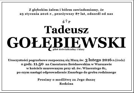 23 stycznia 2016 roku zmarł pilot doświadczalny inż. Tadeusz Gołębiewski,